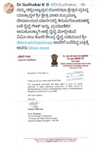 ಈ ಬಗ್ಗೆ ಸಂಸದ ಡಾ.ಕೆ.ಸುಧಾಕರ್ ಅವರು ಸಚಿವರು ಪ್ರತಿಕ್ರಿಯೆ ನೀಡಿರುವ ಕುರಿತು ತಮ್ಮ ಎಕ್ಸ್ ಖಾತೆಯಲ್ಲಿ ಹಂಚಿಕೊಂಡಿದ್ದಾರೆ.