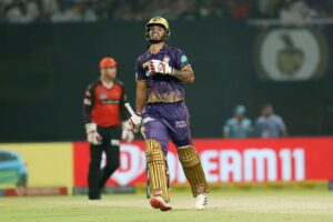 ಬೃಹತ್ ಮೊತ್ತ ಬೆನ್ನಟ್ಟಿದ ಕೊಲ್ಕತ್ತಾ ನೈಟ್ ರೈಡರ್ಸ್ ಆರಂಭಿಕ ಆಘಾತ ಅನುಭವಿಸಿತು, ಭರವಸೆಯ ಆಟಗಾರ ಗುಬಾ೯ಜ್ (0) ಭುವನೇಶ್ವರ್ ಅವರಿಗೆ ವಿಕೆಟ್ ಒಪ್ಪಿಸಿದರು, ಎನ್ ಜಗದೀಶನ್ (36) ರನ್ ಗಳಿಸಿದರೆ ವೆಂಕಟೇಶ್ ಅಯ್ಯರ್ (10), ಸುನೀಲ್ ನರೇನಾ (0), ಪೆವಿಲಿಯನ್ ಸೇರಿದರು.