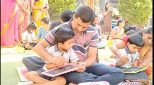 ಮಕ್ಕಳ ಜೊತೆ ಕುಳಿತ ಪೋಷಕರು ಸ್ಲೇಟ್ ನಲ್ಲಿ ತಮ್ಮ ಮಕ್ಕಳಿಗೆ ಅಕ್ಷರಾಭ್ಯಾಸ ಮಾಡಿಸಿದರು, ಮೊದಲ ಅಕ್ಷರವಾಗಿ ಮಕ್ಕಳು ಕನ್ನಡ ವರ್ಣಮಾಲೆಯ ಅ ಆ ಇ ಈ ನ್ನ ಸ್ಲೇಟ್ ನಲ್ಲಿ ಬರೆದು ಶಾಸ್ತ್ರೋಕ್ತವಾಗಿ ಮೊದಲ ದಿನ ಆರಂಭಿಸಿದರು.