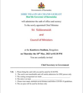 ನೂತನವಾಗಿ ಮುಖ್ಯಮಂತ್ರಿಯಾಗಿ ಸಿದ್ದರಾಮಯ್ಯನವರ ಹೆಸರನ್ನು ಘೋಷಿಸಿದ ನಂತರ ನಾಳೆ ಮಧ್ಯಾಹ್ನ ಬೆಂಗಳೂರಿನ ಕಂಠೀರವ ಸ್ಟೇಡಿಯಂನಲ್ಲಿ ಪ್ರಮಾಣ ವಚನ ಸ್ವೀಕಾರ ಮಾಡುವ ಸಾಧ್ಯತೆಯಿದೆ ಎಂದು ಹೇಳಲಾಗುತ್ತಿದೆ.