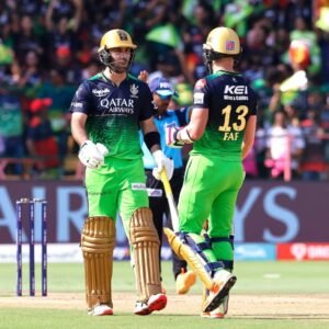 ಆರಂಭಿಕ ಆಘಾತದ ನಡುವೆಯೂ ಫಾಪ್ ಡುಪ್ಲೆಸಿ ಎಂಟು ಬೌಂಡರಿ ಹಾಗೂ ಎರಡು ಸಿಕ್ಸರ್ ಸಹಿತ (62) ರನ್ ಗಳಿಸಿದರೆ ಸ್ಪೋಟಕ ಬ್ಯಾಟಿಂಗ್ ಮಾಡಿದ ಆಲ್ ರೌಂಡರ್ ಗ್ಲೇನ್ ಮ್ಯಾಕ್ಸವೆಲ್ ಆರು ಬೌಂಡರಿ ಹಾಗೂ ನಾಲ್ಕು ಸಿಕ್ಸರ್ ಸಿಡಿಸುವ ಮೂಲಕ (77) ರನ್ ಗಳಿಸಿ ತಂಡವನ್ನು ಬೃಹತ್ ಮೊತ್ತ ಕಲೆ ಹಾಕಲು ಬುನಾದಿ ಹಾಕಿದರು.