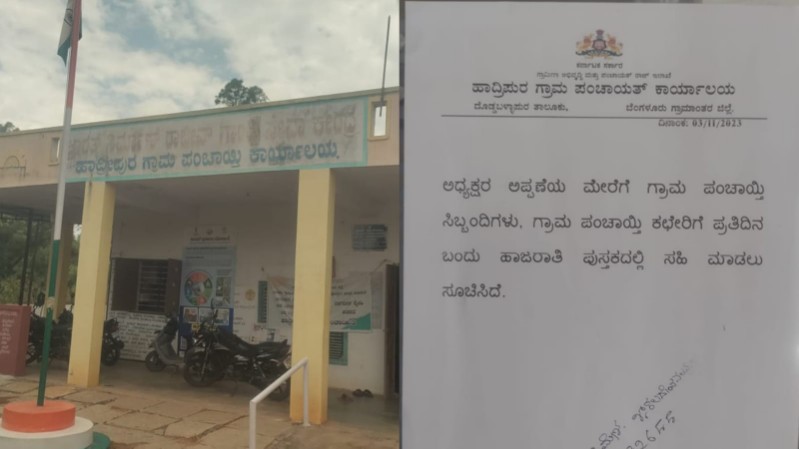 ಅದಕ್ಕೆ ತಾಜಾ ಉದಾಹರಣೆ ಎಂದರೆ ಪಂಚಾಯತಿ ಒಳಕ್ಕೆ ಹೋಗುತ್ತಿದ್ದಂತೆ ಮೊದಲು ಕಾಣುವುದು ಅಧ್ಯಕ್ಷರ ಅಪ್ಪಣೆ ಪತ್ರಗಳು. ಪಿಡಿಓ ಕಚೇರಿಯ ಬಾಗಿಲಿನಲ್ಲಿಯೇ ಈ ಆದೇಶವನ್ನು ಅಂಟಿಸಲಾಗಿದೆ.