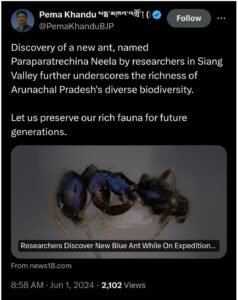 ನೀಲಿ ಬಣ್ಣದ ಅಪರೂಪದ ಇರುವೆ ಪತ್ತೆ ಮಾಡಿರುವ ತಂಡದ ಬಗ್ಗೆ ಮೆಚ್ಚುಗೆ ಸೂಚಿಸಿ ‘ಸಿಯಾಂಗ್ ಕಣಿವೆಯಲ್ಲಿ ಸಂಶೋಧಕರು ಪರಾಪರಾಟ್ರೆಚಿನಾ ನೀಲಾ ಎಂಬ ಹೊಸ ಇರುವೆಯ ಆವಿಷ್ಕಾರವು ಅರುಣಾಚಲ ಪ್ರದೇಶದ ವೈವಿಧ್ಯಮಯ ಜೀವ ವೈವಿಧ್ಯದ ಶ್ರೀಮಂತಿಕೆಯನ್ನು ಮತ್ತಷ್ಟು ಒತ್ತಿಹೇಳುತ್ತದೆ. ಮುಂದಿನ ಪೀಳಿಗೆಗೆ ನಮ್ಮ ಶ್ರೀಮಂತ ಪ್ರಾಣಿಗಳನ್ನು ಸಂರಕ್ಷಿಸೋಣ’ ಎಂದು ‘ಅರುಣಾಚಲಪ್ರದೇಶ ರಾಜ್ಯ ಮುಖ್ಯಮಂತ್ರಿ ಪ್ರೇಮ ಖಂಡು ತಮ್ಮ ಎಕ್ಸ್ ಖಾತೆಯಲ್ಲಿ ಬರೆದುಕೊಂಡಿದ್ದಾರೆ. ಹಾಗೆಯೇ ನೀಲಿ ಬಣ್ಣದ ಇರುವೆಯ ಚಿತ್ರವನ್ನು ಹಂಚಿಕೊಂಡಿದ್ದಾರೆ.