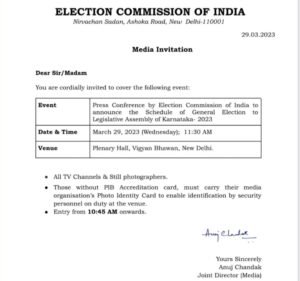 ಪ್ರಸ್ತುತ ವಿಧಾನಸಭೆಯ ಅವಧಿಯು ಮೇ 24, 2023 ರಂದು ಮುಕ್ತಾಯಗೊಳ್ಳುತ್ತದೆ. ಈ ಹಿನ್ನೆಲೆ ಬುಧವಾರ ಚುನಾವಣಾ ಆಯೋಗವು ಕರ್ನಾಟಕ ವಿಧಾನಸಭಾ ಚುನಾವಣೆಗೆ ದಿನಾಂಕ ಘೋಷಣೆ ಮಾಡಲಿದೆ. ವೇಳಾಪಟ್ಟಿ ಪ್ರಕಟವಾದ ಬಳಿಕ ರಾಜ್ಯದಲ್ಲಿ ಮಾದರಿ ನೀತಿ ಸಂಹಿತೆ ಜಾರಿಗೆ ಬರುವ ಸಾಧ್ಯತೆ.