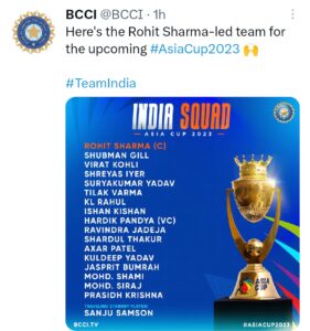 ಬಹು ನಿರೀಕ್ಷೆಯ ಏಷ್ಯಾ ಕಪ್ 2023 ಕ್ರಿಕೆಟ್ ಪಂದ್ಯಾವಳಿಗೆ ಭಾರತ ತಂಡವನ್ನು ಬಿಸಿಸಿಐ ಇಂದು ಪ್ರಕಟಗೊಳಿಸಿದೆ.