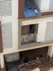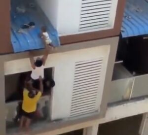 ಕಿಟಕಿಯಿಂದ ಮೊದಲ ಮಹಡಿಯ ಬಾಲ್ಕನಿಗೆ ವ್ಯಕ್ತಿಯೊಬ್ಬರು ಏರುತ್ತಿದ್ದಂತೆ ಮಗು ಬೀಳದಂತೆ ಕೆಳಗಡೆ ಬೀಳದಂತೆ ಜನರು ಬೆಡ್ ಶೀಟ್ ಹಿಡಿದುಕೊಂಡಿದ್ದರು.