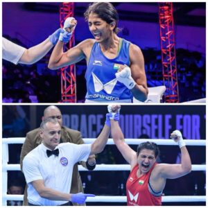 ಬಾಕ್ಸಿಂಗ್ ಫೆಡರೇಶನ್ ಆಫ್ ಇಂಡಿಯಾ ಮಹಿಳಾ ವಿಶ್ವ ಬಾಕ್ಸಿಂಗ್ ಚಾಂಪಿಯನ್ಶಿಪ್ನಲ್ಲಿ ತಮ್ಮ ಅಮೋಘ ಪ್ರದರ್ಶನದೊಂದಿಗೆ ಚಿನ್ನದ ಪದಕಗಳನ್ನು ಗೆದ್ದ ಭಾರತೀಯ ಬಾಕ್ಸರ್ಗಳಾದ ನೀತು ಘಂಘಾಸ್ ಮತ್ತು ಸವೀಟಿ ಬೂರಾ. ಈ ಸಾಧನೆಯಿಂದ ಭಾರತದ ನೂತನ ವಿಶ್ವ ಚಾಂಪಿಯನ್ ಆಗಿ ಮೂಡಿಬಂದಿದ್ದಾರೆ.