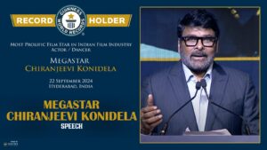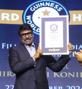 ಹೈದರಾಬಾದ್ ನಲ್ಲಿ ಭಾನುವಾರ ನಡೆದ ಕಾರ್ಯಕ್ರಮದಲ್ಲಿ ಗಿನ್ನಿಸ್ ವಿಶ್ವ ದಾಖಲೆಯ ಪ್ರತಿನಿಧಿಗಳು ಚಿರಂಜೀವಿಗೆ ಅವರಿಗೆ ಪ್ರಮಾಣ ಪತ್ರ ನೀಡಿ ಗೌರವಿಸಿದ್ದಾರೆ.